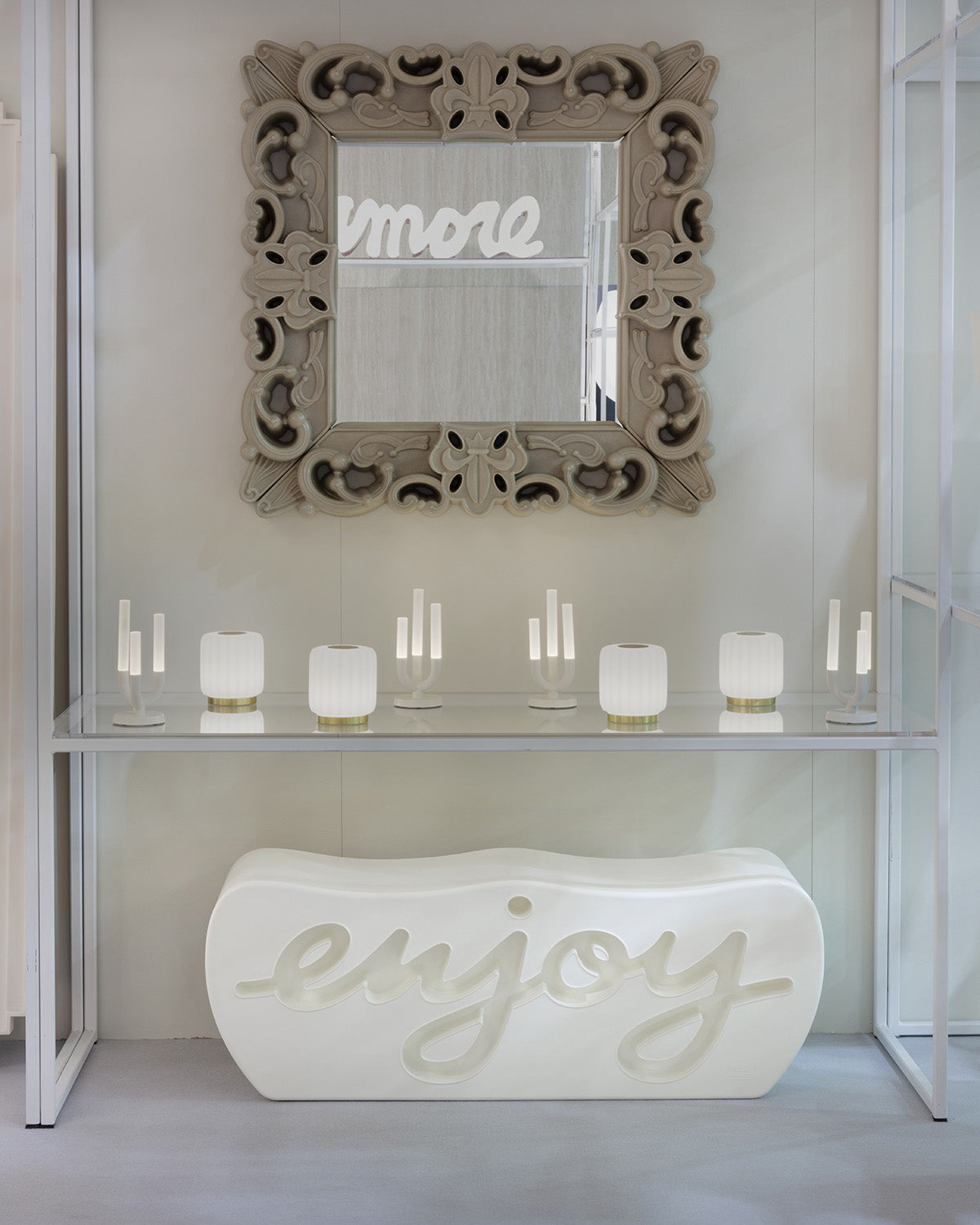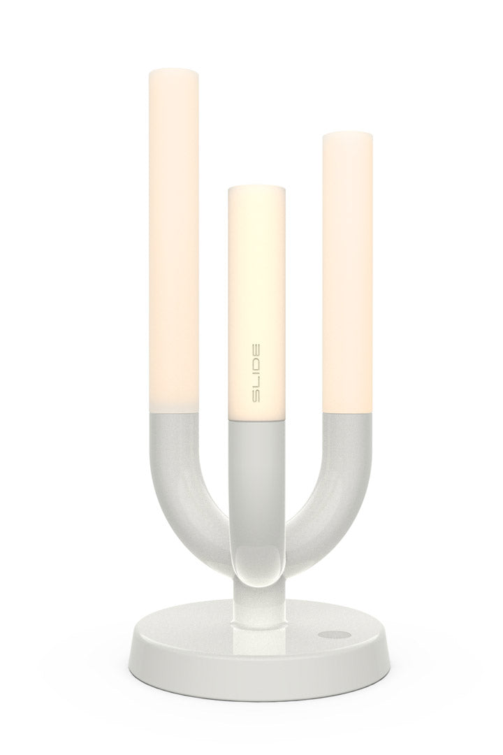 Luna s'inspire des élégants chandeliers présents sur les tables de notre enfance. Les bougies qui se consomment de manière irrégulière, le triptyque des luminaires qui éclairent de manière douce : le tout transposé dans une lampe contemporaine, portable, légère, rechargeable, dimmable, soft touch. La haute performance de Luna est enfermée dans une base en aluminium peint et trois tiges cylindriques en plexiglas mat avec trois sources d'éclairage LED à lumière chaude de 2700K.