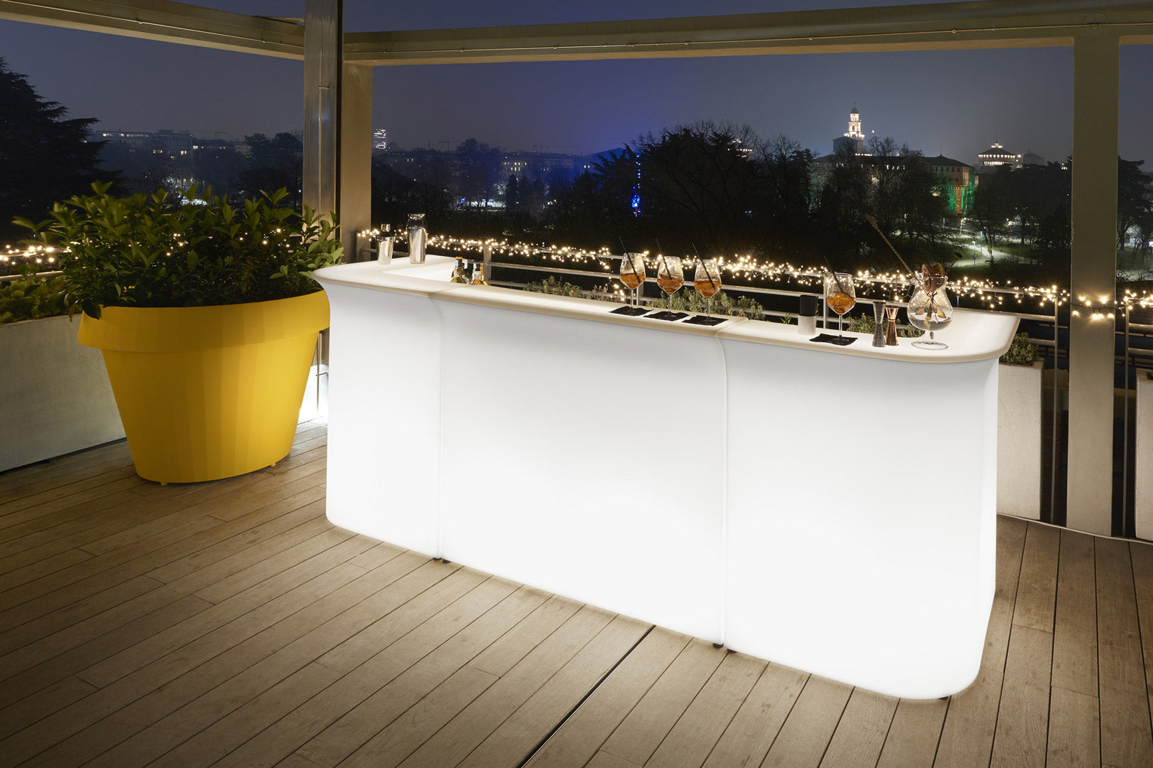 Associé aux autres éléments de la collection, Break Corner permet de composer des bars complets et personnalisés, en intérieur comme en extérieur, pour une mise en scène moderne et tendance.