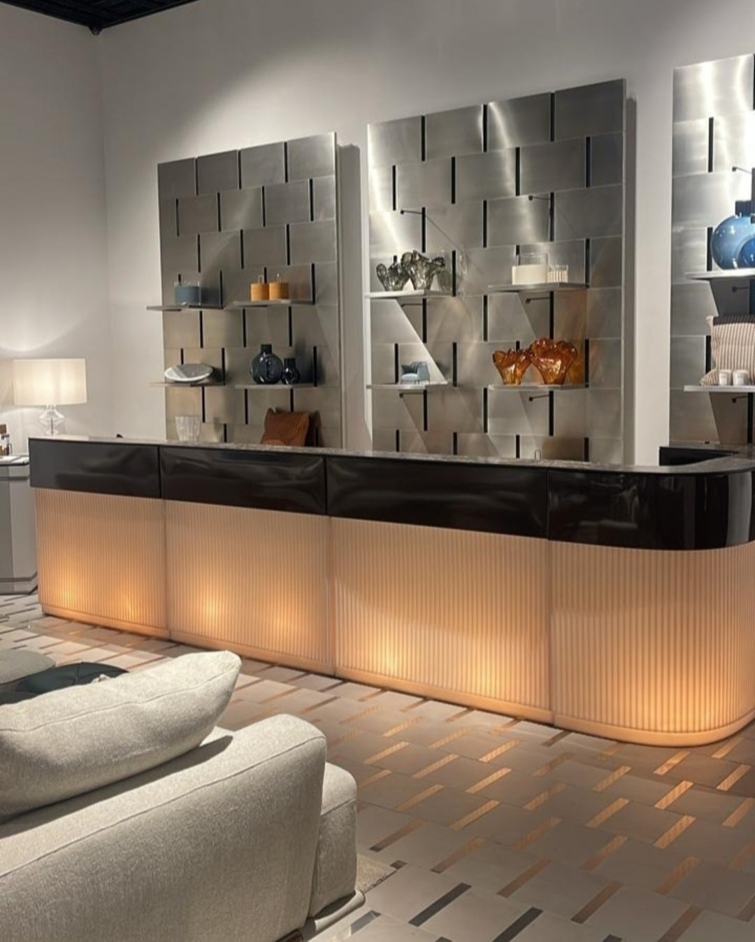 Cordiale Art Déco réinterprète le comptoir linéaire classique avec une touche sophistiquée et glamour typique du style Art Déco. La bande haute laquée dans une couleur spéciale et les tops aux finitions luxueuses, inspirés de la pierre et du bois travaillés à la main, créent un équilibre parfait entre esthétique, technique et fonctionnalité. Cordiale Art Déco combine élégance rétro et modernité pour transformer chaque bar en un point central inoubliable.