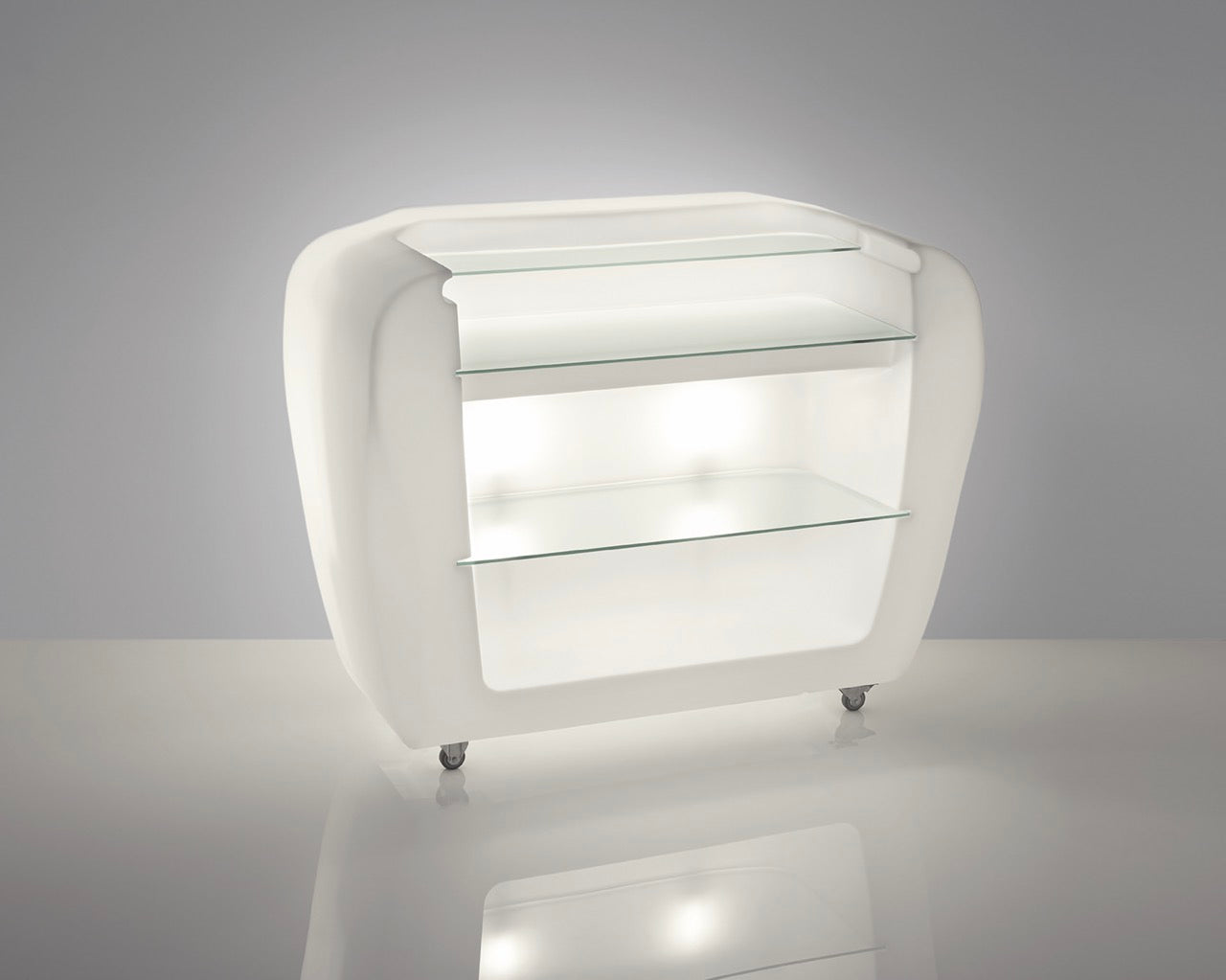 Roller Bar est un comptoir lumineux polyvalent qui peut également servir de bureau de réception. Son design minimaliste et élégant combine esthétique et fonctionnalité : équipé de roues pivotantes et d’étagères internes, il se déplace et se manipule facilement.